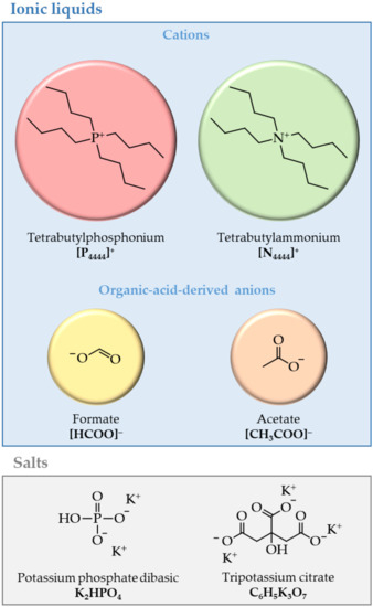 For the synthesis of the organic acid-derived ILs, the following precursors were used: tetrabutylphosphonium hydroxide ([P4444]OH, in water solution at 40 wt.%) and tetrabutylammonium hydroxide ([N4444]OH, in water solution at 40 wt.%), both from Sigma–Aldrich (Saint Louis, MO, USA); acetic acid glacial (PA) and formic acid (91 wt.%) from Fisher Chemical (Geel, Belgium) and Panreac (Barcelona, Spain), respectively. Methanol (HPLC grade) and acetonitrile (99.9 wt.%) were acquired from VWR (Radnor, PA, USA). The salts used in this work (cf. Figure 1) were potassium phosphate dibasic trihydrate (K2HPO4·3H2O, extra pure) and tripotassium citrate monohydrate (C6H5K3O7·H2O, 99 wt.%), purchased from GPR Rectapur (VWR, Radnor, PA, USA) and Scharlau (Barcelona, Spain), respectively. Human transferrin (TF) (>98.0 wt.% pure) was purchased from Sigma–Aldrich (Saint Louis, MO, USA). The water used was double distilled, passed across a reverse osmosis system, and further treated with a Milli-Q plus 185 water purification apparatus (Merck, Darmstadt, Germany).