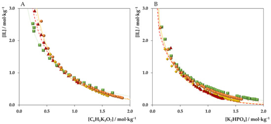 Figure 3 shows the impact of salt on the formation of ABSs. K2HPO4 induces the ABS formation more easily in the presence of synthesized ILs than C6H5K3O7. This trend is unanticipated considering the Hofmeister series and salt ions’ molar entropy of hydration [55]. Accordingly, salts bearing ions of higher valence (e.g., C6H5O73– vs. HPO42–) are more easily hydrated, thus promoting the generation of IL-based ABSs better [55]. Deviations to the Hofmeister series have also been identified in previous works [51,56], particularly concerning polyvalent ions [57]. In this work, by addressing IL anions with high charge density, it seems that there are competing interactions between the salt anions and IL anions to be hydrated and thus to induce the salting-out or to be salted-out.