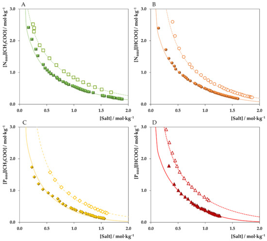 Binodal curves of ABSs comprising [N4444][CH3COO] (A), [N4444][HCOO] (B), [P4444][CH3COO] (C) and [P4444][HCOO] (D) and salts at 25 °C and atmospheric pressure: K2HPO4 (closed symbols) or C6H5K3O7 (open symbols).