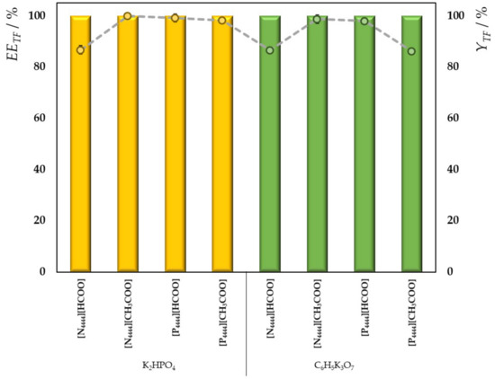 Extraction efficiencies (EETF %, primary scale, bars) and recovery yield (YTF %, secondary scale, points) of transferrin achieved with ABSs comprising organic acid-derived ILs and K2HPO4 (yellow, left) or C6H5K3O7 (green, right) at 25 °C and atmospheric pressure.