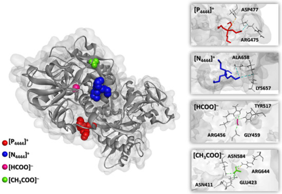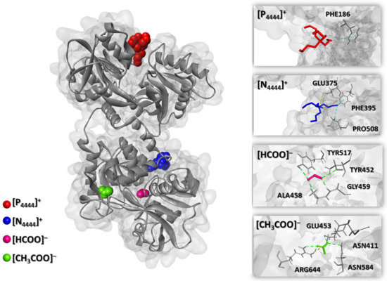 Molecular docking analysis was performed to shed light on possible “protein-IL” interactions. The docking affinity was calculated for the IL ions ([N4444]+, [P4444]+, [CH3COO]– and [HCOO]–) with transferrin at two protonation states by considering the experimentally measured pH of the systems (Table S5 in Supplementary Materials). The bind poses with the lowest absolute value of affinity (kcal·mol−1) for transferrin and IL cations/anions are displayed in Figure 5 and Figure 6. The docking bind energies of each IL ion with transferrin, interacting amino acids residues, and type of interaction and geometry distance (Å) are detailed in Tables S6 and S7 of the Supplementary Materials.