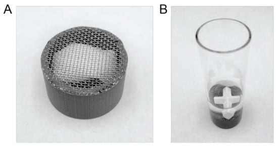 As there is no suitable sinker commercially available, a custom-made sinker was prepared by 3D printing a 12 mm tall, hollow tube with an outside diameter of 21 mm and a wall thickness of 2 mm using polylactic acid (PLA). The structure was designed by computer aided design (CAD) using the online platform Tinkercad from Autodesk (San Rafael, CA, USA), exported as .stl files and converted to a readable file for the printer using the Cura software (version 3.6.0) from Ultimaker (Geldermase, The Netherlands). An Ultimaker 3 extended from Ultimaker (Geldermalsen, The Netherlands) was used to print the tube structures from a 2.85 mm PLA 3D printer filament (Innofil3D BV, Emmen, Netherlands) using a printing temperature of 200 °C and a layer height of 50 µm. After printing, the tube was fitted with a 20-mesh stainless steel sieve (0.84 mm sieve opening) by molding it into the PLA tube at 200 °C using a hot-plate. A picture of the final product loaded with an OTDN pouch can be seen in Figure 1A.
