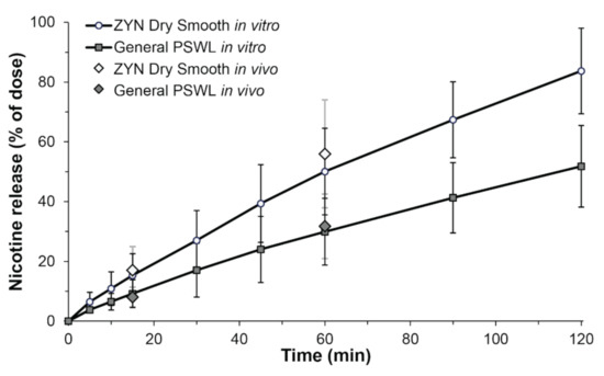 To investigate if the in vitro dissolution method reflected on actual in vivo conditions the results were compared to a previously conducted clinical study. The study enrolled 18 daily snus users aged ≥19 years which kept one pouch at a time still between the upper lip and gum. The in vivo extracted fraction of nicotine from General PSWL, after 15 and 60 min, was 8.0 ± 3.3% and 31.8 ± 10.8%, respectively. For ZYN Dry Smooth, the in vivo extracted fraction of nicotine, after 15 and 60 min, was 17.1 ± 7.8% and 56.0 ± 18.1%, respectively (Figure 2). General PSWL contains 33% more nicotine per pouch than ZYN Dry Smooth does. However, the absolute nicotine release was 32% higher in ZYN Dry Smooth because of a higher extracted fraction of nicotine. The results are in line with previously published data on Swedish snus and ZYN Dry Smooth [16,17,18,27]. The large difference in extracted fractions between both products are likely an effect of their diverse characteristics, in terms of nicotine source (ground tobacco leaves vs. nicotine salt), moisture, pH, and pouch geometry.