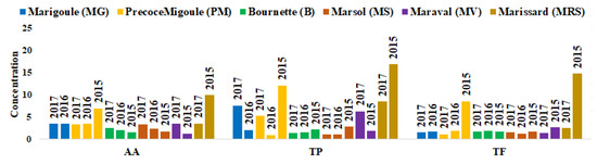 Mean TP, TF and AA values for the studied chestnut cultivars during two consecutive years, 2016 and 2017, investigated in this study and for 2015 reported in a previous study [33] are presented in Figure 1.