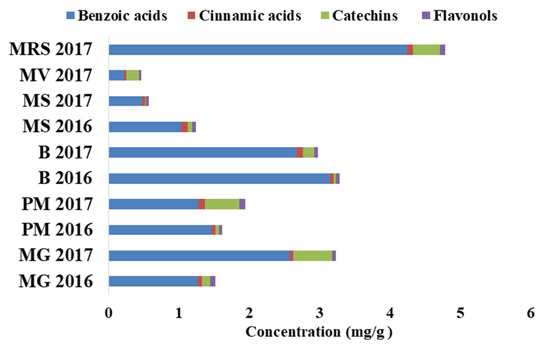 To evaluate the contribution of each class to the total polyphenolic composition, the phenolic bioactive compounds were grouped in the following classes: benzoic acids (gallic, protocatechuic, p-hydroxybenzoic and syringic acids), cinnamic acids (caffeic, p-coumaric, ferulic, cinnamic and chlorogenic acids), catechins ((+)-catechin and (−)-epicatechin) and flavanols (naringin, rutin, myricetin, quercetin, isorhamnetin, apigenin, pinocembrin) and t-resveratrol) (Figure 2). Apigenin, hesperidin and kaempferol were not identified in chestnut extracts, while chrysin and galangin were quantified in very low amounts only in ‘Marigoule’ or quantified below LOQs (Table 2).
