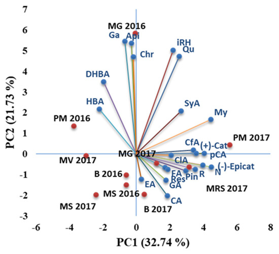 Principal Component Analysis (PCA) of the fruits of different chestnut cultivars based on individual phenolic compounds (‘Précoce Migoule’—PM, ‘Bournette’—B, ‘Marsol’—MS, ‘Marissard’—MRS, ‘Marigoule’—MG and ‘Maraval’—MV).
