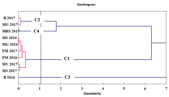 Dendrogram of the fruits of different chestnut cultivars (‘Précoce Migoule’—PM, ‘Bournette’—B, ‘Marsol’—MS, ‘Marissard’—MRS, Marigoule—MG and ‘Maraval’—MV): C1, C2, C3 and C4—classes grouped by dissimilarities criteria.