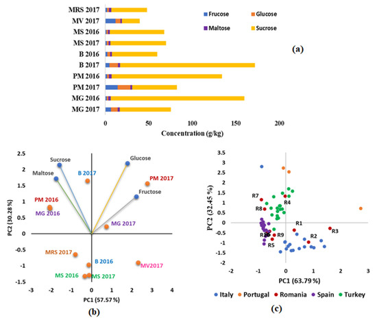 (a) Sugar profile of the analyzed chestnut cultivars harvested in 2016 and 2017; (b) Principal Component Analysis (PCA) of the fruits of different chestnut cultivars based on individual phenolic compounds (‘Précoce Migoule’—PM, ‘Bournette’—B, ‘Marsol’—MS, ‘Marissard’—MRS, ‘Marigoule’—MG and ‘Maraval’—MV); (c) PCA analysis based on sugar composition of chestnut fruits harvested in some European countries.