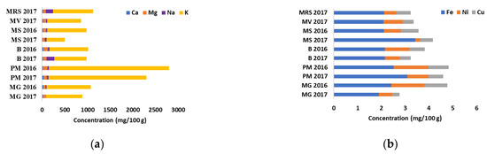 In general, fructose and glucose were quantified in equal amounts in the studied chestnut cultivars, with fructose ranging between 1.55–14.35 g/kg DW and glucose ranging between 1.56–14.46 g/kg DW, the highest contents corresponding to ‘Précoce Migoule’ harvested in 2017 (Figure 7a). The higher fructose amount compared to the glucose one corresponds to ‘Maraval’, thus being considered as a functional food for consumers suffering from type 2 diabetes [80]. Our data were higher than those reported by other authors which found glucose and fructose concentrations between not detected and 3.1 g/kg DW for both monosaccharides [81] or between 0.56–2.40 g/kg DW for fructose and 0.49–1.90 g/kg DW for glucose [29], but in the same range as Mert et al. who report fructose between 1.5–8.0 g/kg DW and glucose between 4.0–11.3 g/kg DW [10]. Maltose was quantified in low amounts, with values between 1.77 and 3.16 g/kg DW. It can be concluded that the 2017 harvest year, in which there were higher temperatures and more abundant rainfall, was more favorable to accumulate sugars in ‘Bournette’, while the 2016 harvest year was more favorable for ‘Marigoule’ and ‘Précoce Migoule’ cultivars.