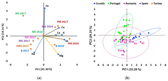 No clear discrimination can be observed between the fruits of different chestnut cultivars. Along the PC1 axis most cultivars harvested in 2017 can be discriminated, except ‘Maraval’ and ‘Marsol’, while the PC2 axis seems to discriminate the ‘Précoce Migoule’ cultivar from the others. It can be noticed that phenolic compounds, such as gallic, ellagic, cinnamic, chlorogenic and caffeic acids, (+)-catechin and (−)-epicatechin, have the largest contribution to the total variation, along PC1, these compounds being quantified in high amounts in the 2017 harvest year, compared with the 2016 harvest year.