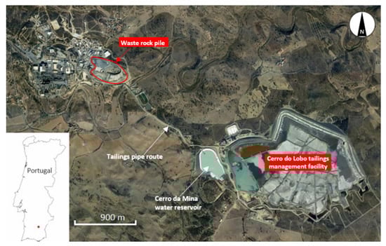 A fresh tailing sample (NC_02) and a fresh waste rock sample (NC_01) were obtained from the Cerro do Lobo tailings management facility (TMF) at Neves-Corvo mine, Portugal (Figure 2). Neves-Corvo is a currently-active underground high-grade Cu–(Sn)–Zn mine located in the Alentejo district of southern Portugal. The Neves Corvo volcanogenic massive sulfide (VMS) deposit is located at the western edge of the famous Iberian Pyrite Belt (IPB) [43,44]. Mining operations, currently conducted by SOMNICOR, Lundin mining’s subsidiary in Portugal, started with surface drillings in 1977 and later progressed to underground exploitation of copper ore in 1988, tin ore in 1990 (depleted in 2005), and zinc ore in 2006 [45]. The mineralized zones consist of seven massive sulfide ore bodies (Neves, Corvo, Graça, Zambujal, Lombador, Monte Branco, and Semblana) [44] and the main products of the mine are copper, zinc, and lead concentrates [43]. Tailings and waste rock are the two major mine waste products from mining activities at Neves Corvo. In 2010, the mine shifted from sub-aqueous storage of tailings to sub-aerial deposition of thickened tailings in the TMF using waste rocks as containment berms. About 3.1 Mt of waste rock was stored in a temporary stockpile, while 7.3 Mt and 17 Mt of waste rock and tailings, respectively, were stored together at the Cerro do Lobo tailings management facility between 2010 and 2019 [46].