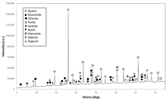 The respective mineral compositions of the three mine waste samples (Table 2) were determined by quantitative X-ray diffraction (QXRD) (PANalytical Empyrean, 35 kV and 35 mA, 5–80° scan range, Co anode material, PIXcel3D-Medipix3 1 × 1 Area detector, Malvern Panalytical Ltd., Malvern, United Kingdom). In preparation for the QXRD analysis, the samples were wet-milled in 10 mL ethanol using zirconium oxide grinding elements in a McCrone XRD-Mill (Retsch GmbH, Haan, Germany). After grinding, the samples were air-dried overnight in petri dishes. The dried samples were homogenized with steel balls (4 mm diameter) using a Retsch mixer mill MM 400. The samples were transferred into sample holders (24 mm diameter) using the backloading method and then measured. Mineral phase identification was carried out using Profex 4.1.0 software with Rietveld refinement by Döbelin and Kleeberg [48].
