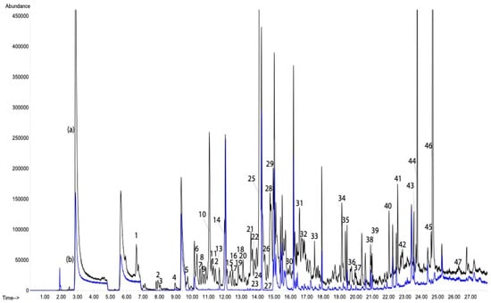 Chromatogram of (a) AL sample—leaves mixture from all collected plants from Albarracín (black line) compared to (b) blank (empty vial) (blue line) obtained by HS-SPME-GC-MS. Legend has been presented in Table 2.
