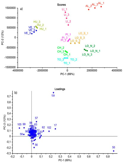 Results of PCA analysis where (a) graph of scores, numbers 1–3 indicate three replicates of the same sample; (b) graph of loadings, numbers of loadings indicate compounds presented in Appendix A Table A1.