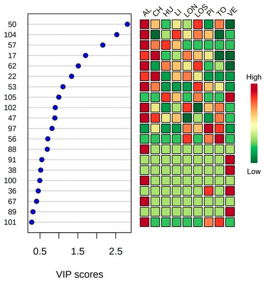 Figure 3 shows PLS-DA analysis results, where the twenty most important metabolites are plotted according to the PLS-DA variable importance in projection (VIP) scores. VIP scores measure the importance and contribution of the variables to the PLS-DA model.