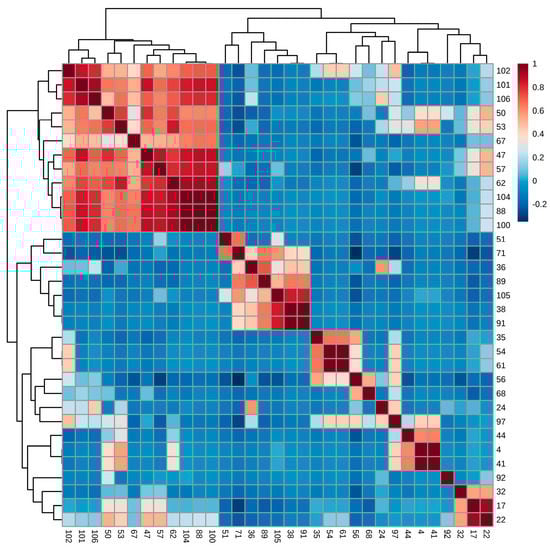 All the most essential compounds determined by PCA, and PLS-DA were selected, and Pearson correlation analysis was performed and presented in Figure 4. The figure shows a positive correlation between the compounds obtained for compounds with r > 0.8 (marked in red colour). It means that an increase in the relative area of one compound increases the relative area of another correlated compound in the same sample. An example can be the correlation between one ester and one phenol, such as dihydro methyl jasmonate and 2,4-di-tert-butylphenol. When r = 0, there is no correlation. Finally, when r is lower than 0, there is a negative correlation between the compounds.