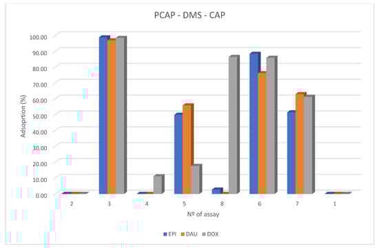 Good adsorption efficiencies (>90%) were achieved in all fabrics tested under at least one of the conditions. Hence, for the selection of the fabric in the following tests, different factors were considered. A bigger sample volume would imply a higher preconcentration factor, so a fabric that obtained good results with 20 mL as sample volume was sought. On the other hand, a shorter extraction time implies a faster methodology, so a fabric that obtained the best results when extracted for 15 min was selected. With these considerations in mind, the fabric PCAP-DMS-CAP was selected for the next stage. Therefore, extraction conditions were set as follow: extraction time = 15 min., sample volume = 20 mL and pH = 3. In these conditions a mean adsorption (n = 8) of 80 ± 9% of DOX, 85 ± 7% of DAU and 87 ± 7% of EPI on the selected fabric was obtained. All these results are presented in Figure 2.