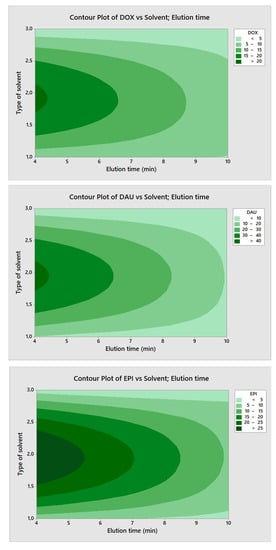 After completing the whole design, a statistical study of the results was carried out through Pearson’s correlation and the p-value. It was found that all the variables affect the process, as indicated by the p-value; however, Pearson’s correlation did not indicate which value should take the variable (Table 3). Regarding to Pareto charts, it was only found for DOX that the pairwise combination of the variables was significant. EPI and DAU present a similar pattern, but their graphs were below the line of significance. For that reason, it was decided to select the intermediate values of each variable. In this sense, a new experimental design with 32 was prepared. The variables selected were solvent (MeOH, ACN and MeOH/ACN (50:50)) and elution time (4, 7 and 10 min.). A value of 1 mL was set for the elution volume due to that volume of 0.5 mL did not completely cover the fabric, which can lead to recovery and reproducibility errors. Results of this second experimental design are shown in Figure 3. In the Figure, the solvents are codified as follows: MeOH = 1, MeOH/ACN (50:50) = 2 and ACN = 3.