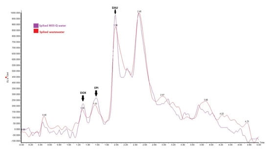 Most of the authors have used liquid chromatography tandem mass spectrometry (LC-MS/MS) as the separation and determination technique, which allows to measure very low concentrations, but it is expensive and can be strongly influenced by the matrix effect that can produce, in most cases, a significant suppression of the analyte signal. For this reason, it is a parameter that must be evaluated; however, few authors have done so. In this sense, and regarding to anthracyclines, Yin et al. [] obtained a range of signal suppression in sewage from 6–78%. On the other hand, Martín et al. [] had reported practically no matrix effect, ranging from −5 to 20%. Franquet-Griell et al. [] obtained also a low matrix effect (between −28 and 6%) but, in this case, it may be attributed to the studied matrix (river water). Rabii et al. [] suffered also a significant suppression of the signal of 78% for EPI using on-line SPE and Gomez-Canela et al. [] obtained a recovery of 44% when EPI was injected directly into the LC–Orbitrap–MS equipment. They explained the low recovery due to ion suppression or poor water stability, that is, matrix effect.