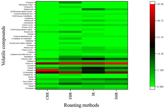 Heat map of total volatile compounds present in lamb patties cooked by four cooking methods. The abbreviations indicate CRR for charcoal-grilled, EBR for electric-barbecue-grilled, IR for infrared-grilled and SHR for superheated-steam-roasted.