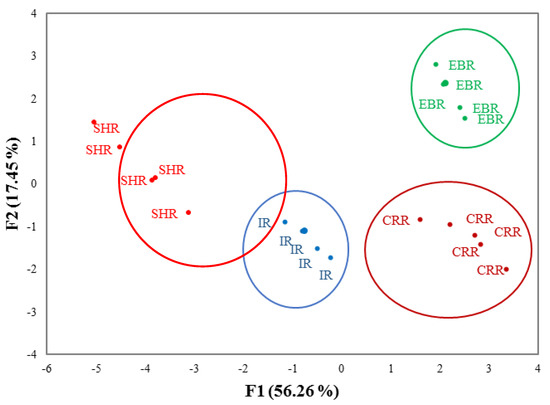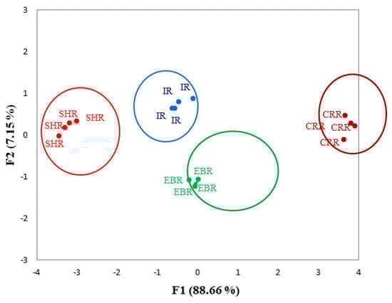 Principal component analysis score projection of e-tongue flavour analysis of charcoal-grilled, electric-barbecue-grilled, infrared-grilled and superheated-steam-roasted lamb patties. The abbreviations indicate CRR for charcoal-grilled, EBR for electric-barbecue-grilled, IR for infrared-grilled and SHR for superheated-steam-roasted.