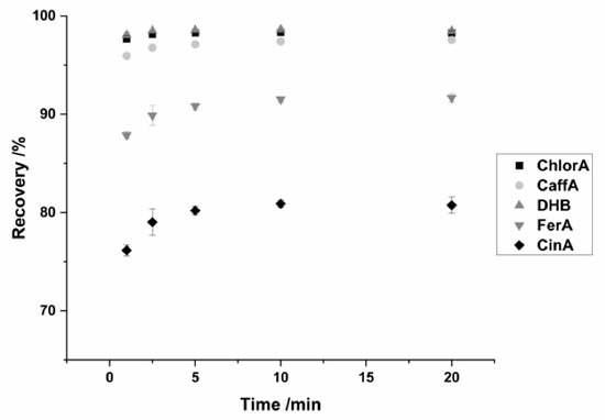 To investigate the effect of the extraction time on the adsorption equilibrium, analyte extraction was performed for different time periods (1.0, 2.5, 5.0, 10.0 and 20.0 min). DSPE experiments were carried out according to Section 2.5. The conditioning was performed with a 0.5 mL phosphate buffer pH 7.0 and the sample consisted of 1 mL of 500 mg L−1 phenolic acid standard mix. The obtained supernatant after loading was analyzed.