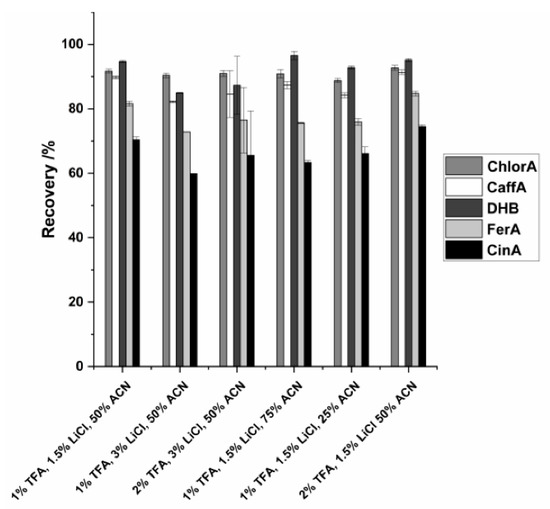 In order to optimize the elution of analytes from the solid sorbent, different eluting conditions were applied. In the preliminary experiments, MeOH and ACN with and without different concentrations of TFA were tested. Furthermore, the addition of NaCl and LiCl was investigated. It was found that higher recoveries could be achieved with ACN compared to MeOH and LiCl compared to NaCl. By adding water to the organic solvent, the solubility of the LiCl was improved and the analyte recoveries could further be increased. Based on these results, six different eluting solutions containing various quantities of TFA, LiCl, ACN and water were tested. The highest recoveries for all analytes (except DHB) could be obtained with 2 vol.% TFA, 1.5% (w/w) LiCl and 50 vol.% ACN in water (Figure 2). All results are provided in Table S3.