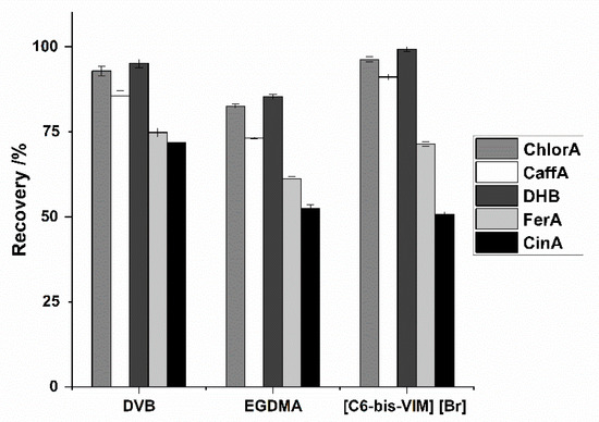 It is noteworthy that despite the lower loading capacities of poly(n-VIM/C6-bis-VIM) compared to the DVB crosslinked polymer, higher recoveries could be achieved for DHB, ChlorA and CaffA. This circumstance can possibly be explained by the more complete elution when using the [C6-bis-VIM] [Br] crosslinked polymer.