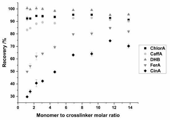 Analyte recovery results obtained from DSPE experiments with [C6-bis-VIM] [Br] crosslinked vinylimidazole polymers with different monomer to crosslinker ratios. Standard deviations are given as error bars.