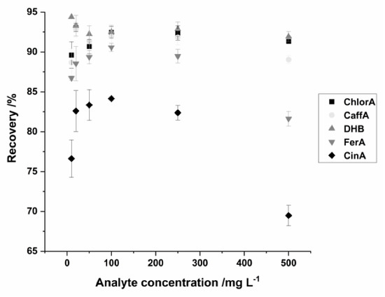 The effect of differently crosslinked polymers on the extraction efficiency towards phenolic acids is displayed in Figure 3 and the results are summarized in Table S10. All solid sorbents exhibited different percentage recoveries indicating the significant influence of the crosslinker. All sorbents showed the same systematic increase in recoveries following the order: CinA ˂ FerA ˂ CaffA ˂ ChlorA ˂ DHB. This circumstance could be due to the common basic structure of all three polymers, which is due to the use of the same monomer VIM. The reason why the extraction recoveries followed this particular order can probably be explained by the different pKa values. The lower the pKa, the stronger the acid, which means that the substance dissociates more strongly in water. Therefore, DHB and ChlorA with the lowest pKa values should also exhibit the highest proportion of dissociated molecules in anionic form. Since the sorbent used is an anion exchanger, more analytes could be bound to the sorbent via ionic interactions compared to the other phenolic acids. This consequently also led to higher extraction recoveries. CaffA, FerA and CinA have similar pKa values, however they exhibited different extraction recoveries. A reason could be the different number of hydroxyl groups in their chemical structures. Occurring hydrogen bonds may increase the adsorption force between the phenolic acids and sorbent, which could explain the previously stated order of recoveries.