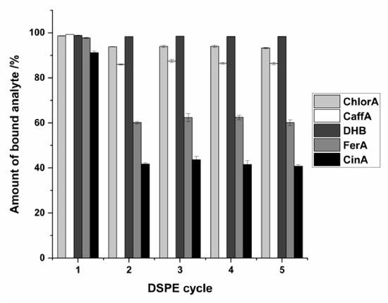 The reusability of the poly(n-VIM/C6-bis-VIM) polymer with a monomer to crosslinker ratio of 11.50 to 1 was investigated by performing multiple DSPE cycles. Therefore, after each loading step the sorbent was regenerated, dried, and reused. In Figure 6, the quantity of bound phenolic acids after one to five DSPE cycles is displayed. Further data is given in Table S12. The applied polymer showed excellent reusability results for DHB with a maximum adsorption decrease of 0.6%. Good reusability results were also obtained for the ChlorA and CaffA with a maximum decrease in adsorption of 5.3 and 13.4%, respectively. A considerable decrease in the adsorption performance was observed for FerA and CinA with a maximum decrease of 30.7 and 50.3%, respectively. It is noteworthy that the quantity of bound ChlorA, CaffA, FerA and CinA mainly decreased after the first DSPE cycle and remained constant after the subsequent cycles. It is possible that the washing solution containing LiCl salt was responsible for this trend by influencing the binding properties of the sorbent. Since the FerA and CinA generally exhibited the weakest binding strength, they were probably the most affected by this effect. By optimizing the washing solution, it is likely to also result in a better reusability for FerA and CinA.