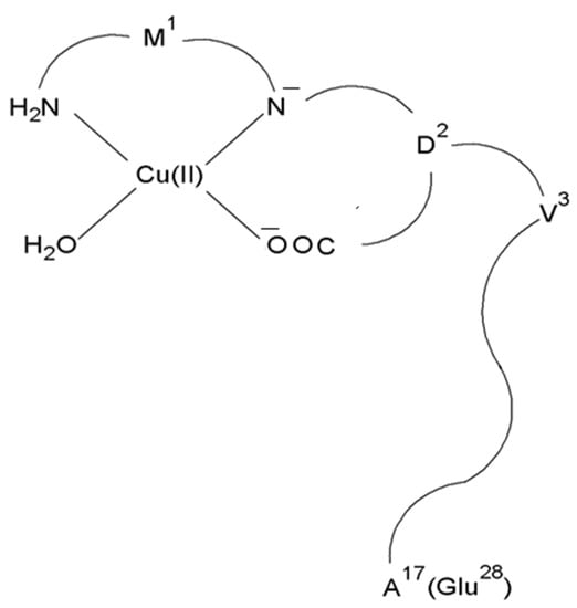 - Kowalik-Jankowska, T.; Ruta, M.; Wiśniewska, K.; Łankiewicz, L. Coordination abilities of the 1-16 and 1-28 fragments of β-amyloid peptide towards copper(II) ions: A combined potentiometric and spectroscopic study. J. Inorg. Biochem. 2003, 95, 270–282. [Google Scholar] [CrossRef]