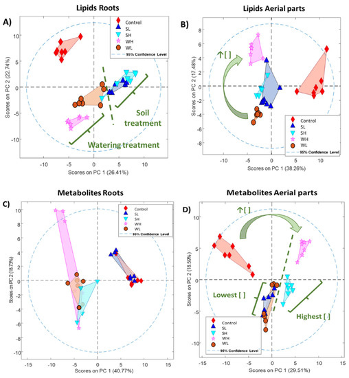 PCA score plots are shown for negative ionization mode obtained in the analysis of both tissues, roots, and aerial parts. (A,B) represent lipidomic analysis of roots and aerial tissues, respectively. Analogously, (C,D) refer to metabolomic analysis of roots and aerials. Both in lipidomic and metabolomic samples from root tissue are more affected by treatment rather than by concentration level, whereas aerial parts have the opposite scenario.