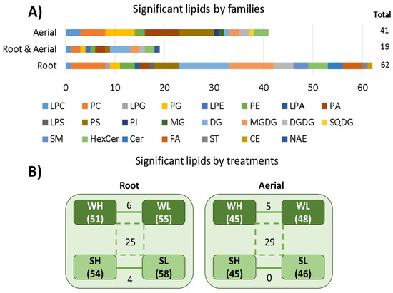 Annotated lipids, selected from those MCR-ALS resolved components whose peak areas were significant (higher VIPs from PLS-DA results, see above), mainly belonged to three lipid classes: glycerophospholipids (52%), glycerolipids (30%), and sphingolipids (12%). Figure 2A shows the proportion of significant lipids among each family in aerial parts, roots, and both tissues simultaneously. There is an increase of affected glycerolipids in roots (e.g., DGs, MGDGs, and DGDGs), in contrast with a slight increment in certain glycerophospholipids (e.g., PGs and PAs) in aerial tissues. Figure 2B depicts the number of significantly affected lipids is given for the different treatments. Most of the annotated lipids were found significant in all four treatments (WH, WL, SH, and SL) in comparison to control samples. Nevertheless, some specific compounds were related only to watering or soil exposure (e.g., four DGs suffered changes in roots when soil treatment was applied).