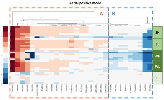 Hierarchical clustering heatmap applied to the logarithm of the fold changes of the annotated lipids for aerial positive ionization set. An intensity color bar is included on the left side of the figure, indicating the relative abundance of the lipid regarding control samples (higher abundance in red, lower abundance in blue). Two clusters are differentiated, with increasing abundance (A) and diminishing abundance (B).