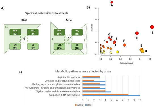 (A) Summary of the common metabolites expressed by the different treatments, with especial emphasis in the lower effect on SL group in roots. (B) Visualization of MetaboAnalyst results indicating the most affected metabolic pathways regarding arsenic exposure from Table 1, for the simultaneous analysis of all tissues and ionization modes. Letter code for the pathways corresponds to: (A) aminoacyl-tRNA biosynthesis; (B) alanine, aspartate, and glutamate metabolism; (C) glycine, serine, and threonine metabolism; (D) phenylalanine metabolism; (E) isoquinoline alkaloid biosynthesis; (F) tryptophan metabolism; (G) arginine biosynthesis; (H) phenylalanine, tyrosine, and tryptophan biosynthesis; (I) arginine and proline metabolism; (J) butanoate metabolism; (K) glyoxylate and dicarboxylate metabolism. (C) Comparison of the number of significant metabolites related to the main metabolic pathways affected by the exposure from (B), according to the tissue analyzed (roots vs. aerials).