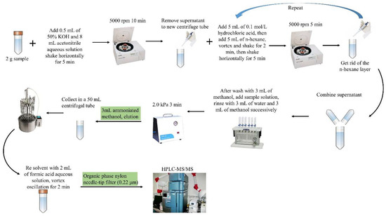 The eluent was concentrated by nitrogen blowing, added to 2 mL of the initial mobile phase for redissolution, vortexed and shaken for 2 min, and filtered through an organic-phase syringe filter (13 mm × 0.45 μm) for analysis. The sample pretreatment process is shown in Figure 1.