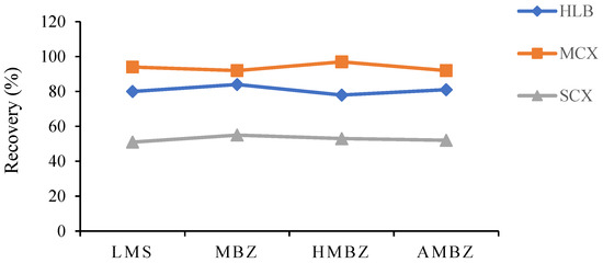 LMS, MBZ, HMBZ, and AMBZ in the matrix were analyzed by HPLC–MS/MS with six replicates, and the recovery rate was determined at four concentrations. Finally, according to the detected concentration in the calibration curve matching the blank matrix, the peak recovery rate was calculated. The stability of the standard curve, instrument performance, and environmental conditions were evaluated.