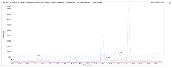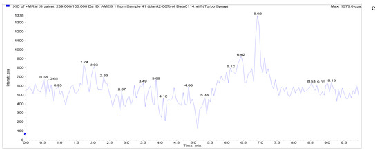 Total ion chromatograms and extracted ion chromatograms of blank hen whole egg samples. ((a) Total ion chromatogram; (b) extracted ion chromatogram of LMS; (c) extracted ion chromatogram of MBZ; (d) extracted ion chromatogram of HMBZ; (e) extracted ion chromatogram of AMBZ).