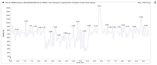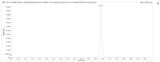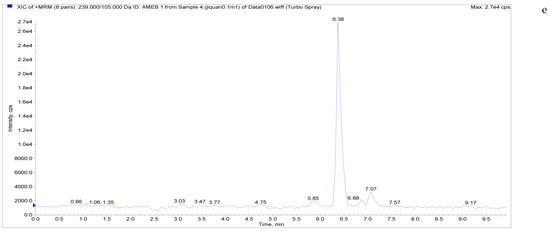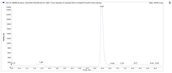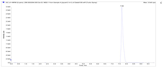 The specificity of the established method was evaluated by testing different blank poultry egg samples and samples with different drug standard concentrations. The total ion chromatogram and extracted ion chromatogram of a blank hen whole egg sample are shown in Figure 4. Quantitative total ion chromatograms and extraction ion chromatograms after the addition of LMS, MBZ, HMBZ, and AMBZ to blank eggs are shown in Figure 4. The specificity of the analytical method for blank eggs was determined by comparing Figure 4 and Figure 5. Figure 4 shows that LMS, MBZ, HMBZ, and AMBZ were not contained in the blank chicken whole egg samples. This shows that the method has good specificity.