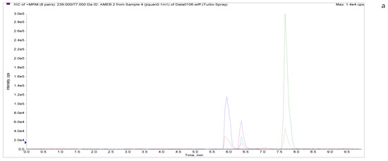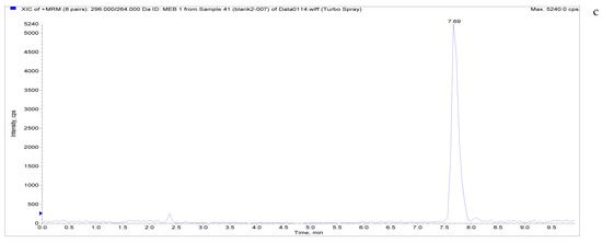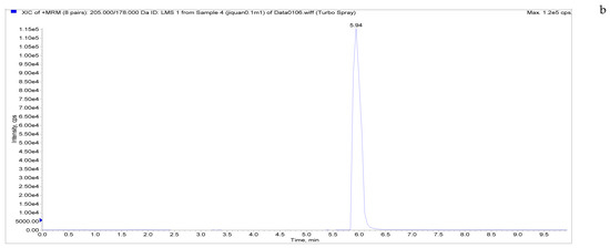 The four prepared spectral tuning solutions (50 ng/mL) were injected by a mass spectrometer needle pump in constant flow mode. The mass spectrometer was operated in ESI+ scanning and MRM modes in positive mode to optimize the ion source parameters by monitoring the MS/MS spectra of the analytes. The fog collision gas (CAD) was high-purity nitrogen; to simultaneously monitor the corresponding protonated molecular ions for all analytes, a spray voltage of 5500 eV, a vaporizer, an ion transport tube temperature of 550 °C, a sheath gas (high-purity nitrogen) pressure of 50 psi, an auxiliary gas (high-purity nitrogen) pressure of 50 psi, a collision gas impact chamber outlet voltage pressure (CXP) of 12 V, and an intake voltage (EP) of 10 V were used. The retention time and optimized MS parameters of LMS, MBZ, HMBZ, and AMBZ are shown in Table 2.