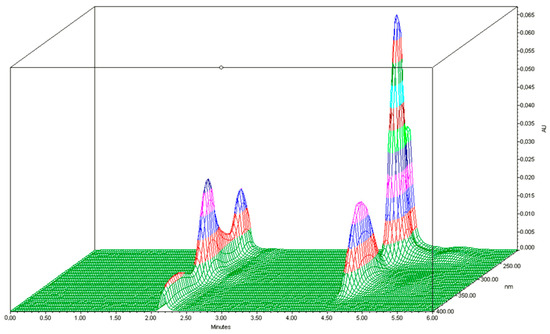 Photodiode array detectors provide three-dimensional information that allows an accurate assessment of peak identification, purity and quantitation in a single run. We used our spectral library to establish peak homogeneity and identity. The study was conducted under the Good Laboratory Practice (GLP) regulations at our GLP-compliant laboratory LAFARLE (University of Leon, Spain), certified by the Spanish Agency of Medicines and Medical Devices (AEMPS) [14].
