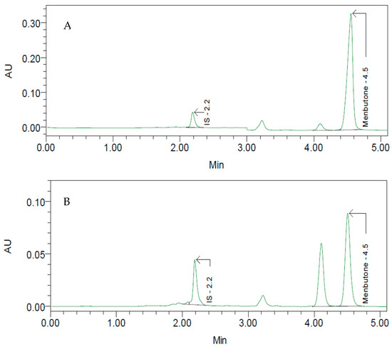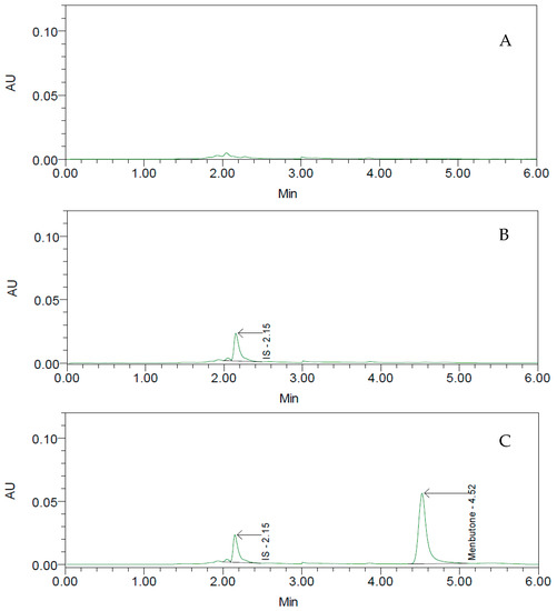 Representative HPLC chromatogram of: (A) Blank plasma sample; (B) zero sample (IS, 2 μg/mL); (C) plasma sample fortified with menbutone (5 µg/mL) and IS (2 µg/mL).