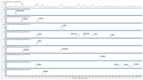 Chromatographic and mass spectrometric separation of Ibuprofen and 17 cannabinoids in a standard mixture. Top Chromatogram shows the total ion chromatogram and the other chromatograms are extracted at the mass of compound/s.