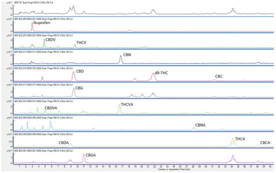 All cannabinoid reference standards were purchased from Novachem Pty Ltd. (Heidelberg, Australia) as ampoules of 1000 µg/mL solutions. The standards for (±)-delta9-Tetrahydrocannabinolic acid A (Δ9-THCA-A), Tetrahydrocannabivarinic Acid (THCVA), Cannabidiolic acid (CBDA), Cannabidivarinic acid (CBDVA), Cannabigerolic acid (CBGA), Cannabinolic Acid (CBNA), Cannabichromenic Acid (CBCA), (±)-Cannabicyclol (CBL), and Cannabicyclolic Acid (CBLA) were supplied in acetonitrile. While the standards for (−)-delta9-Tetrahydrocannabinol (Δ9-THC), (−)-delta8-Tetrahydrocannabinol (Δ8-THC), Tetrahydrocannabivarin (THCV), Cannabidiol (CBD), Cannabidivarin (CBDV), Cannabigerol (CBG), Cannabinol (CBN), and Cannabichromene (CBC) were supplied in methanol. Ibuprofen was purchased from Sigma-Aldrich Pty Ltd. (North Ryde, NSW, Australia). HPLC grade ethanol (Scharlau, Scharlab S.L., Barcelona, Spain) was used for sample extractions, and LC-MS grade solvents (Honeywell Research Chemicals, Seelze, Germany) and MilliQ water (Merck Millipore, Billerica, MA, USA) were used to prepare mobile phase.