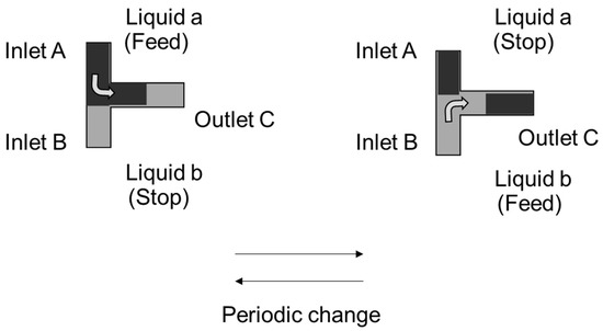 The concept of slug flow generation in this study is illustrated in Figure 1. Here, different insoluble liquids were supplied through channels A and B. In channel C, a flow state wherein the two phases flowed alternately (slug flow) was generated. Liquids A and B from inlets A and B, respectively, were merged in the T-junction pipe, and liquids A and B flowed alternately from outlet C. A slug flow with a controlled slug length (volume) could be generated by synchronizing and cyclically repeating the starting and stopping of liquid flow from inlets A and B (Figure 1).