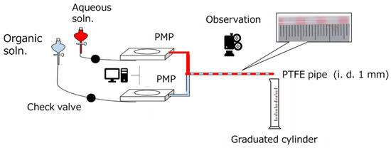 The experimental setup used in this study is illustrated in Figure 2. A controller was used to control the two PMPs, and a predetermined frequency and voltage were applied to generate a slug flow by merging the aqueous and oil phases in the T-junction tube. Each aqueous and oil phase was stored in a separating funnel and fed to the PMPs in a downflow manner. A check valve was installed to reduce the mutual influence of the PMPs. The slug flow was directed through a polytetrafluoroethylene (PTFE) tube with an inner diameter of 1 mm, and the flow was photographed. The liquid released from the outlet of the PTFE tube was weighed in a female cylinder, and the volumetric flow rate and linear velocity of the liquid were calculated based on its volume, the length of the PTFE tube, and time.