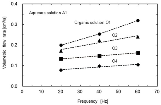 The effect of liquid kinematic viscosity on the volumetric flow rate was investigated using a single PMP. Using the A1 solution as the aqueous phase and O1–O4 (0.75–2.26 mPa∙s) as the oil phases, the relationship between the frequency of the diaphragm and the volume flow rate was determined (Figure 3). As the frequency of the diaphragm pump increased, the volume flow rate of each liquid increased linearly. However, this relationship was not directly proportional. Furthermore, with an increasing kinematic viscosity of the liquid, the volume flow rate decreased. Thus, it is suggested that the kinematic viscosity of the liquid affects the amount of liquid discharged from the pump.