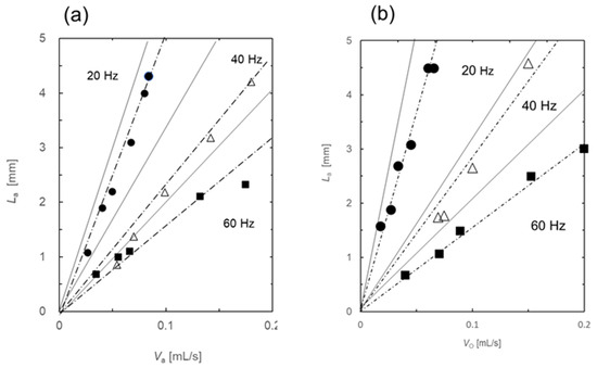 We considered the equation for the slug length generated by the PMP. If the slug length is [mm], the volumetric flow rate is [mL/s], and the set frequency of the device is f [Hz], Equation (1) can be established as follows: