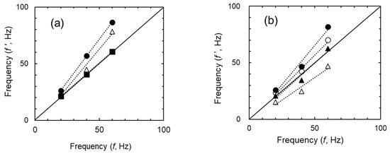 These results can be interpreted as the effect of the kinematic viscosity of the liquid, i.e., a lower pumping rate leads to a shorter slug length, which, in turn, leads to an apparent increase in the PMP frequency. Because it is difficult to independently analyze the effects of the amplitude and frequency, we introduce the term “effective frequency” (f′ [Hz]) as the apparent frequency to comprehensively evaluate these. Here, f′ was obtained by correlating the straight-line slope with the experimental values in Figure 4, replacing f with f′ in Equation (1).